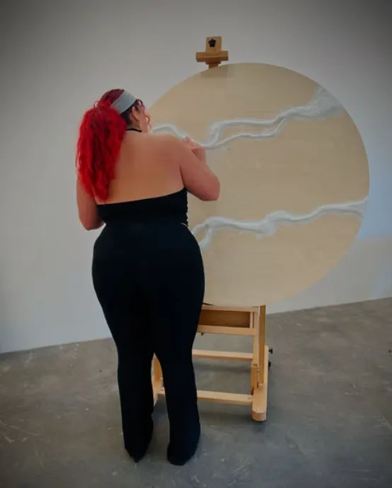 G'ianna Perez is a Houston-based mixed-media artist whose work explores the balance between texture and light. Through layers of epoxy resin and modeling paste, she creates luminous surfaces that invite stillness and movement to coexist.